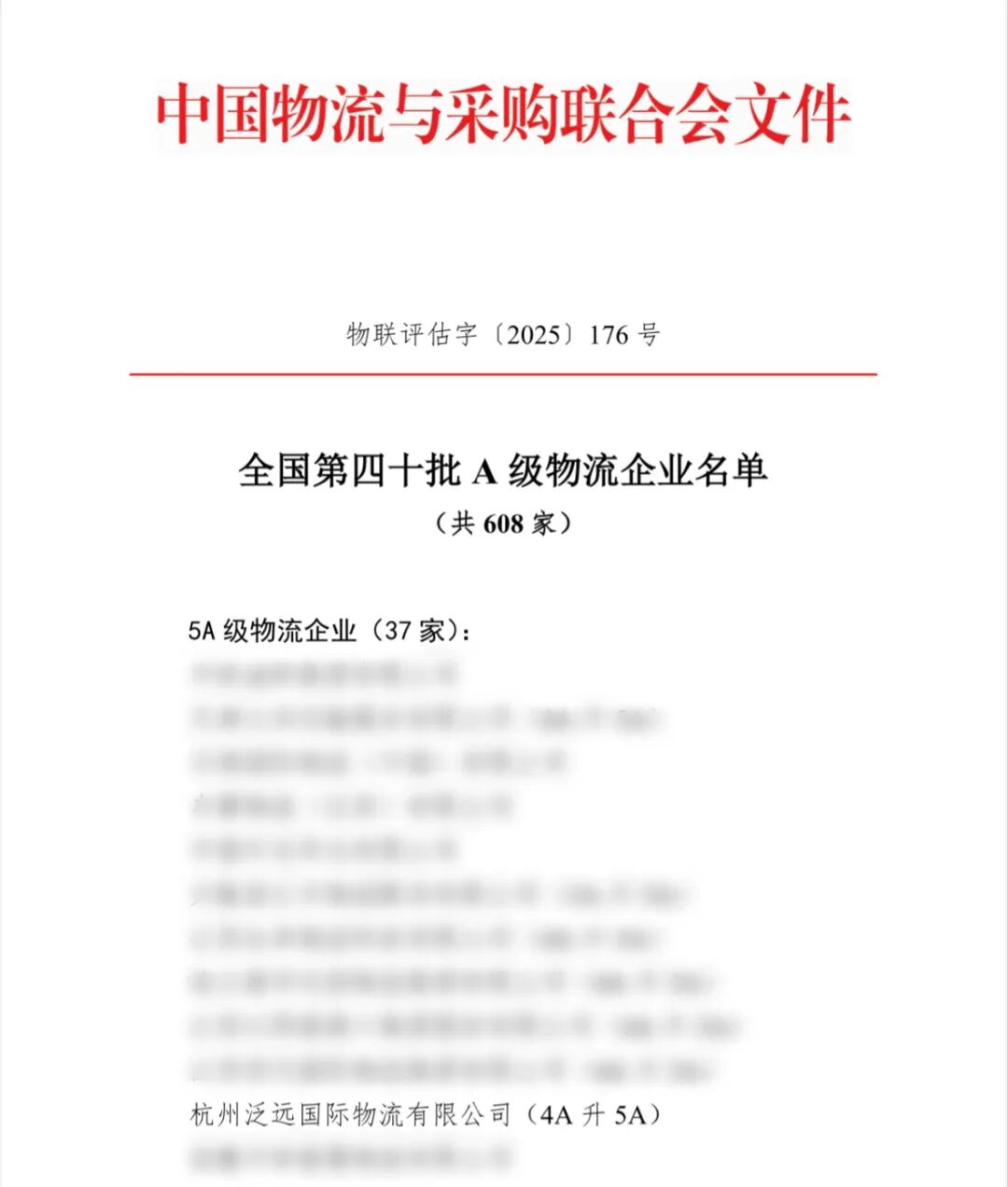 中物联于9月26日正式发布了第四十批A级物流企业名单,泛远国际凭借其综合实力,历经“企业自检、自主申报、网上审核、现场评估、现场答辩、网上公示”等层层考核,成功晋级“5A级物流企业”,成为本批次浙江省唯一获此殊荣的企业。